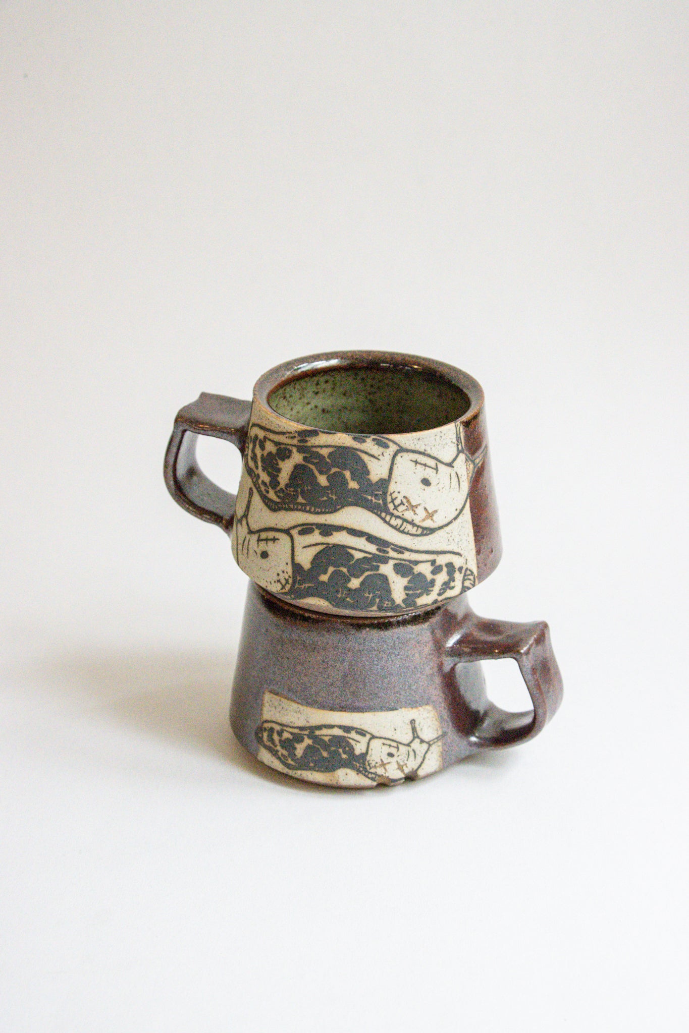 A slug mug that's sure to make any nature lover smile. Each mug features two banana slugs stacked on one side and one on the reverse. Handle, inner and some of the side are glazed. Please note that each mug's glaze will appear slightly different.