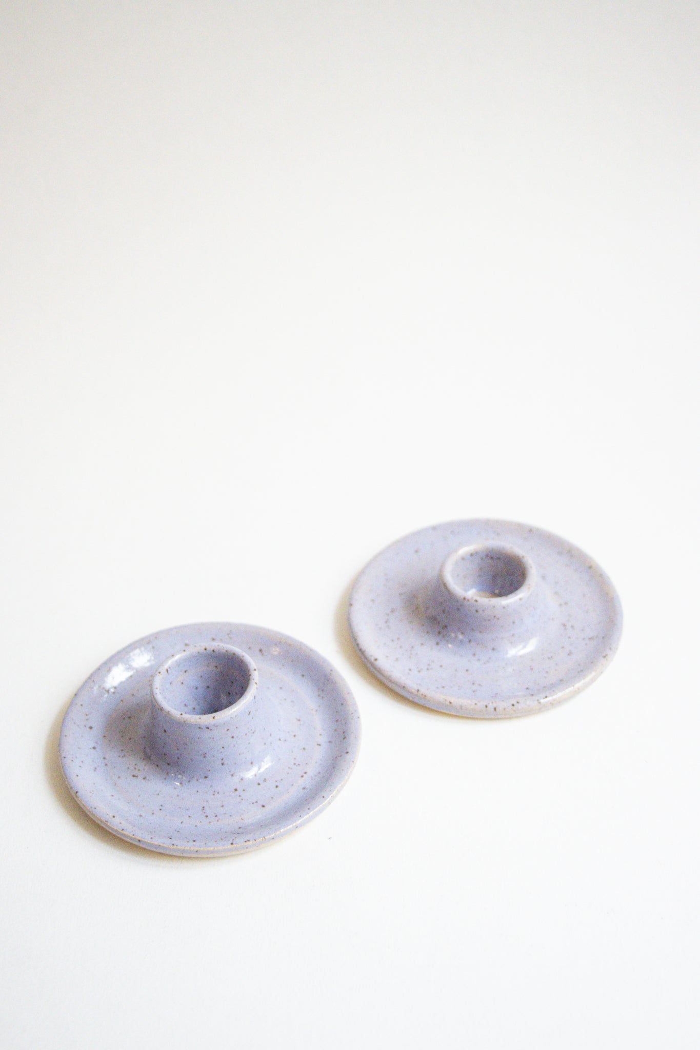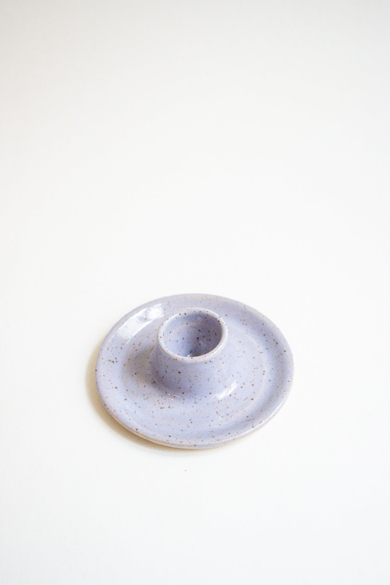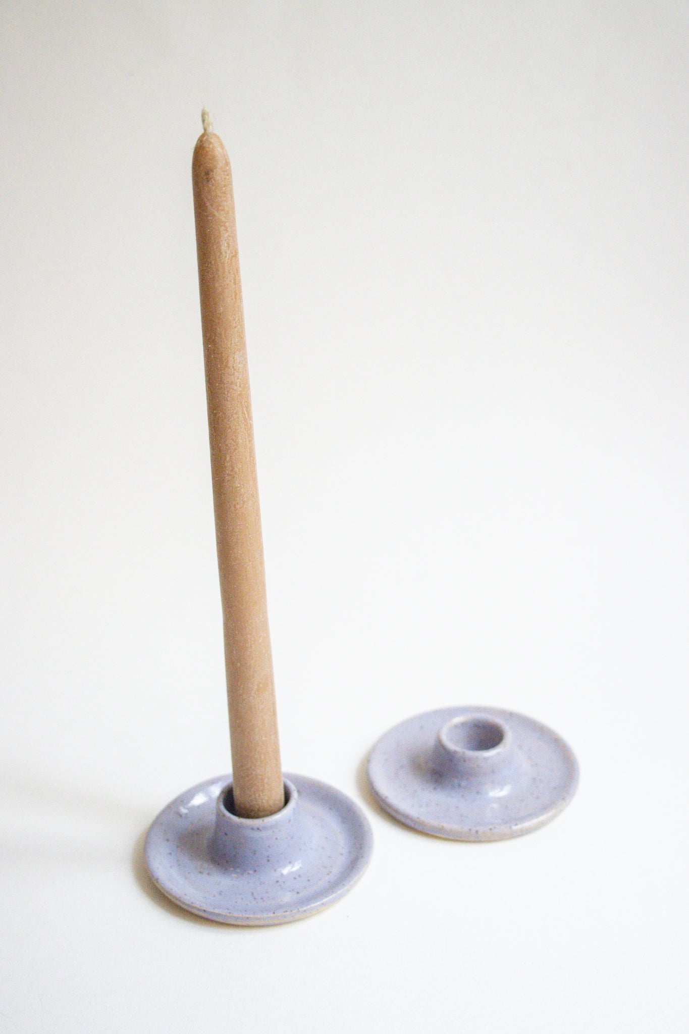 Wheel thrown taper candle holder in a speckled clay with a light blue glaze. Sold by the each, please add two to cart if you would like a pair.