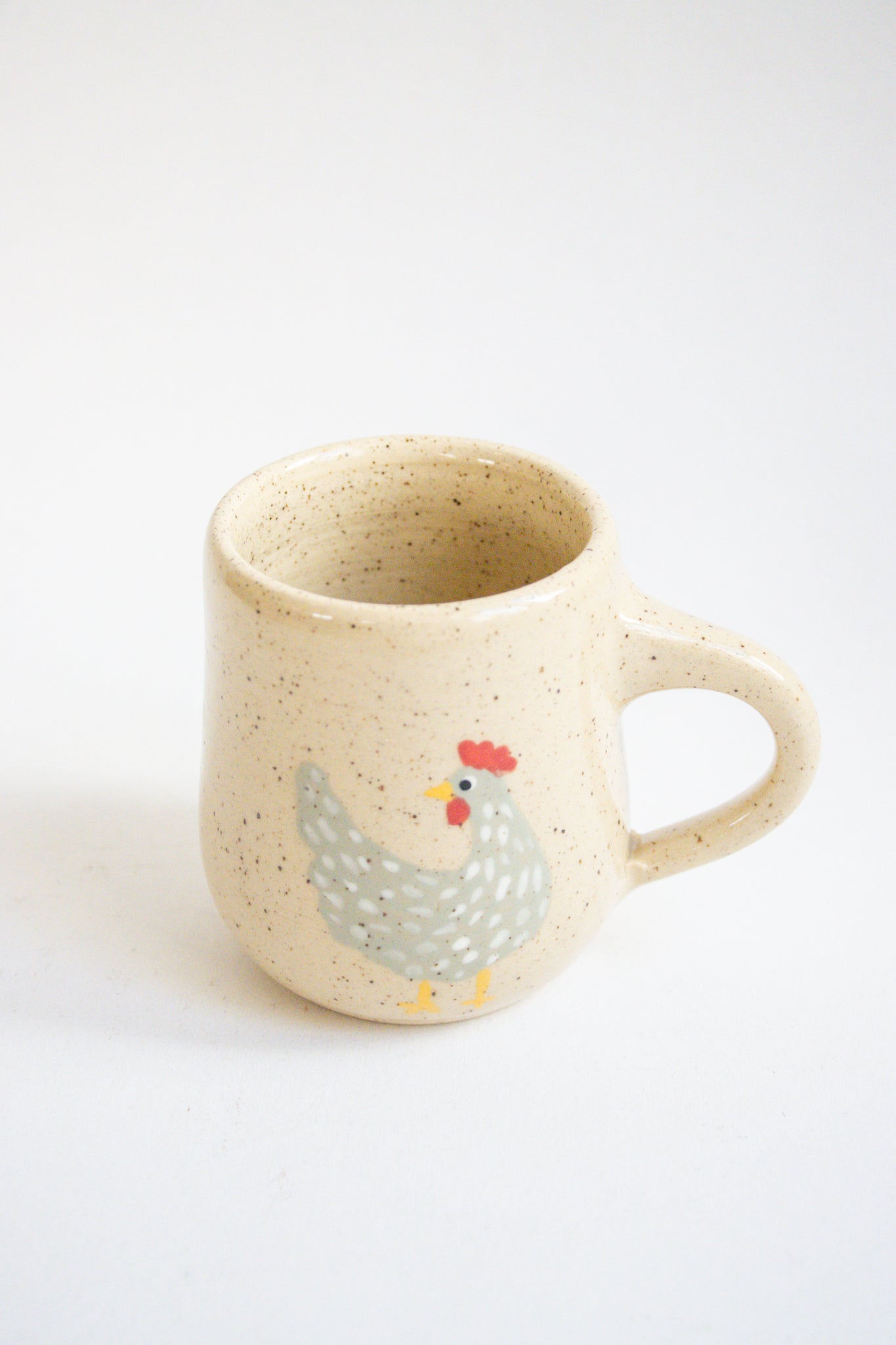 A beautiful wheel thrown mug with a hand painted chicken and floral design. Choose from a black, grey or beige chicken. Colours and shapes will vary slightly with each mug giving you a 100% one of a kind piece.