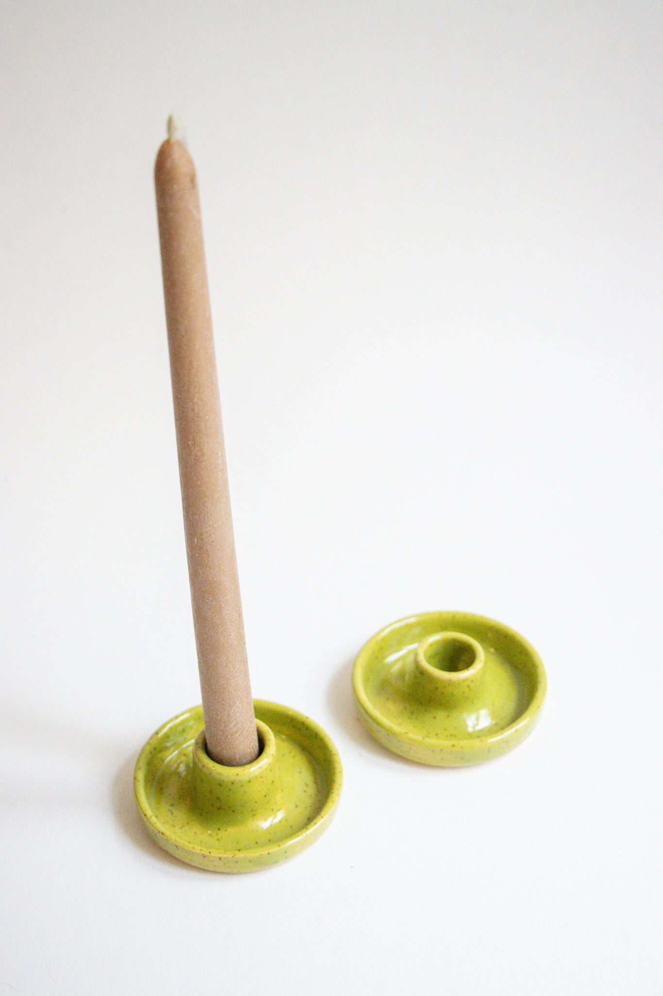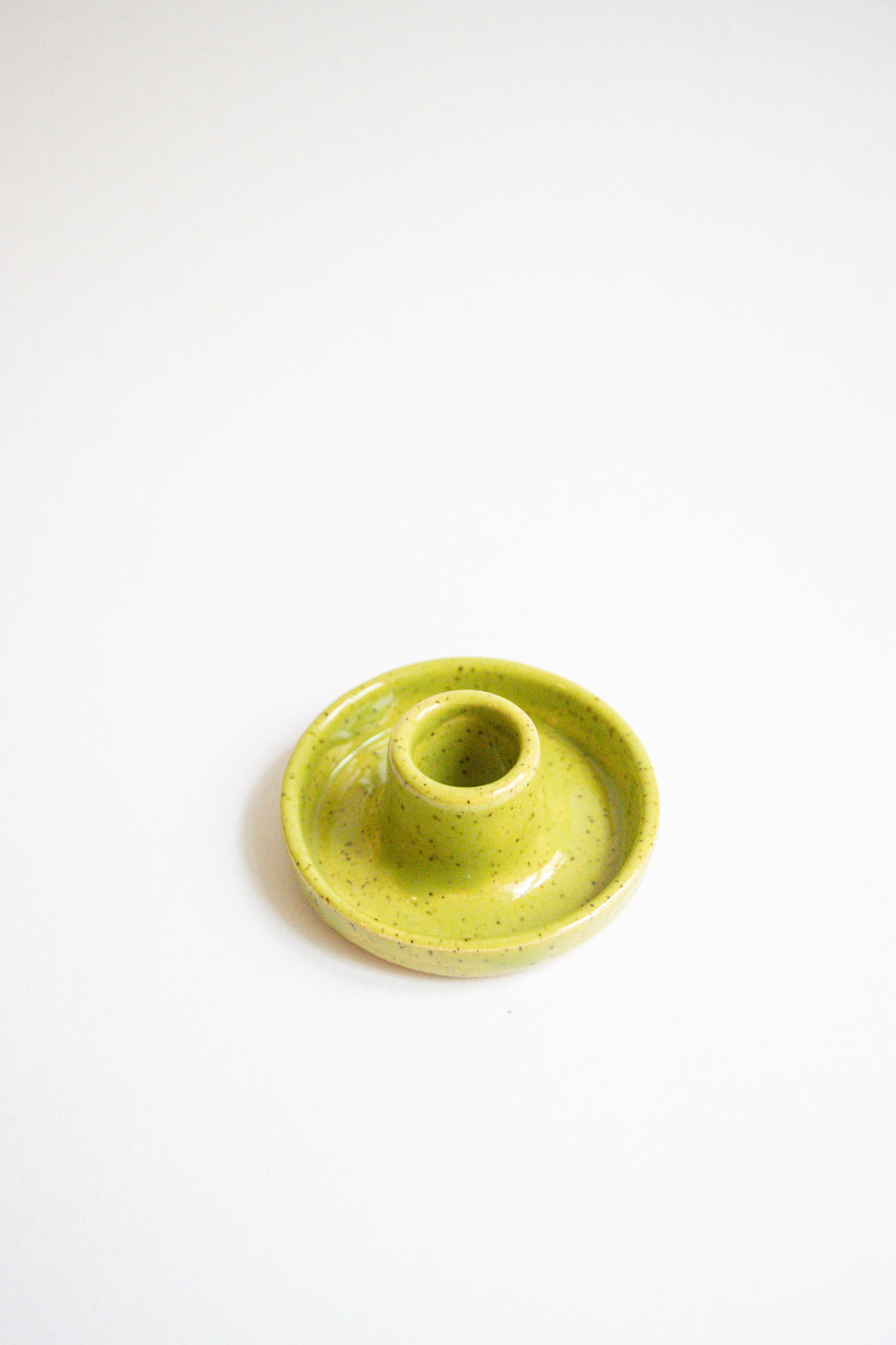 Wheel thrown taper candle holder in a speckled clay with a lime green glaze. Sold by the each, please add two to cart if you would like a pair.