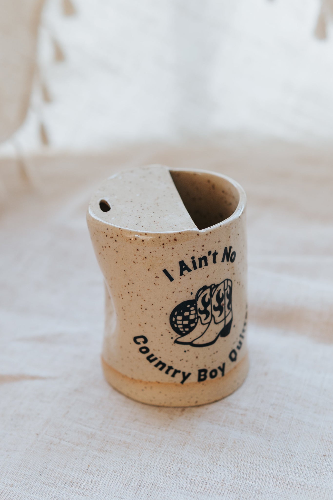 The perfect travel cup for on the go! Features a disco ball and cowboy boots image on each side with the saying "I ain't no country boy quitter." Half lid for easy sippin' and a thumb rest indent for easy holding. Please note each piece is one of a kind and there may be slight differences from the pictures shown.