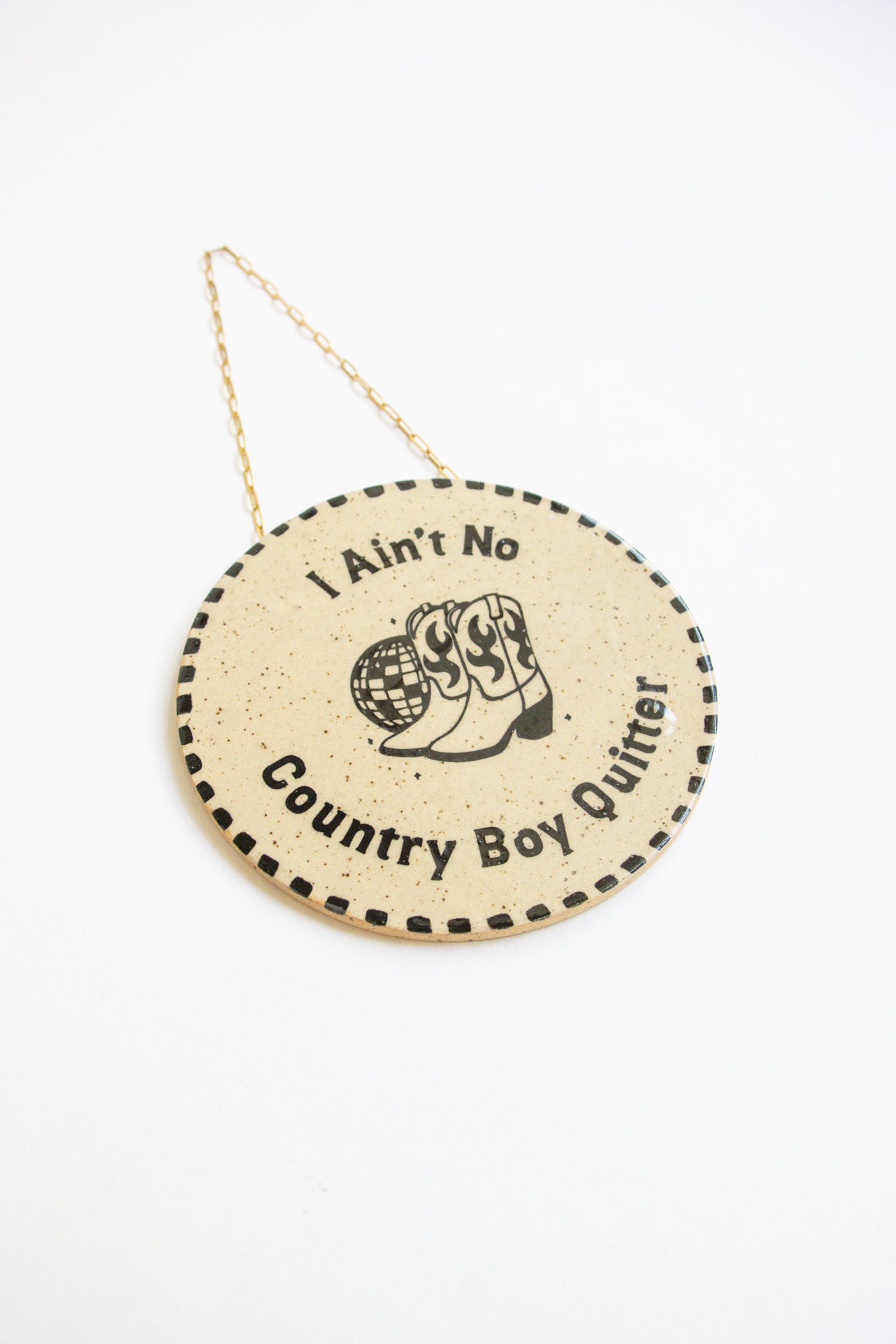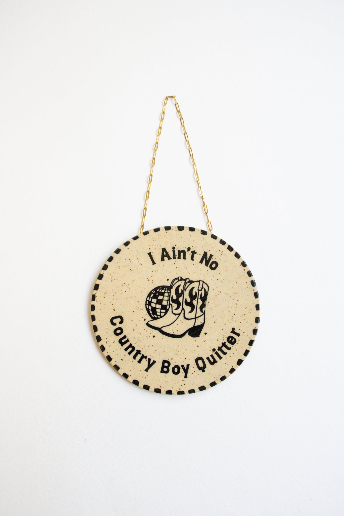 A cute ceramic wall hanging! Features a disco ball and cowboy boots image with the saying "I ain't no country boy quitter." . Please note each piece is one of a kind and there may be slight differences from the pictures shown including slight variations in clay colouring.