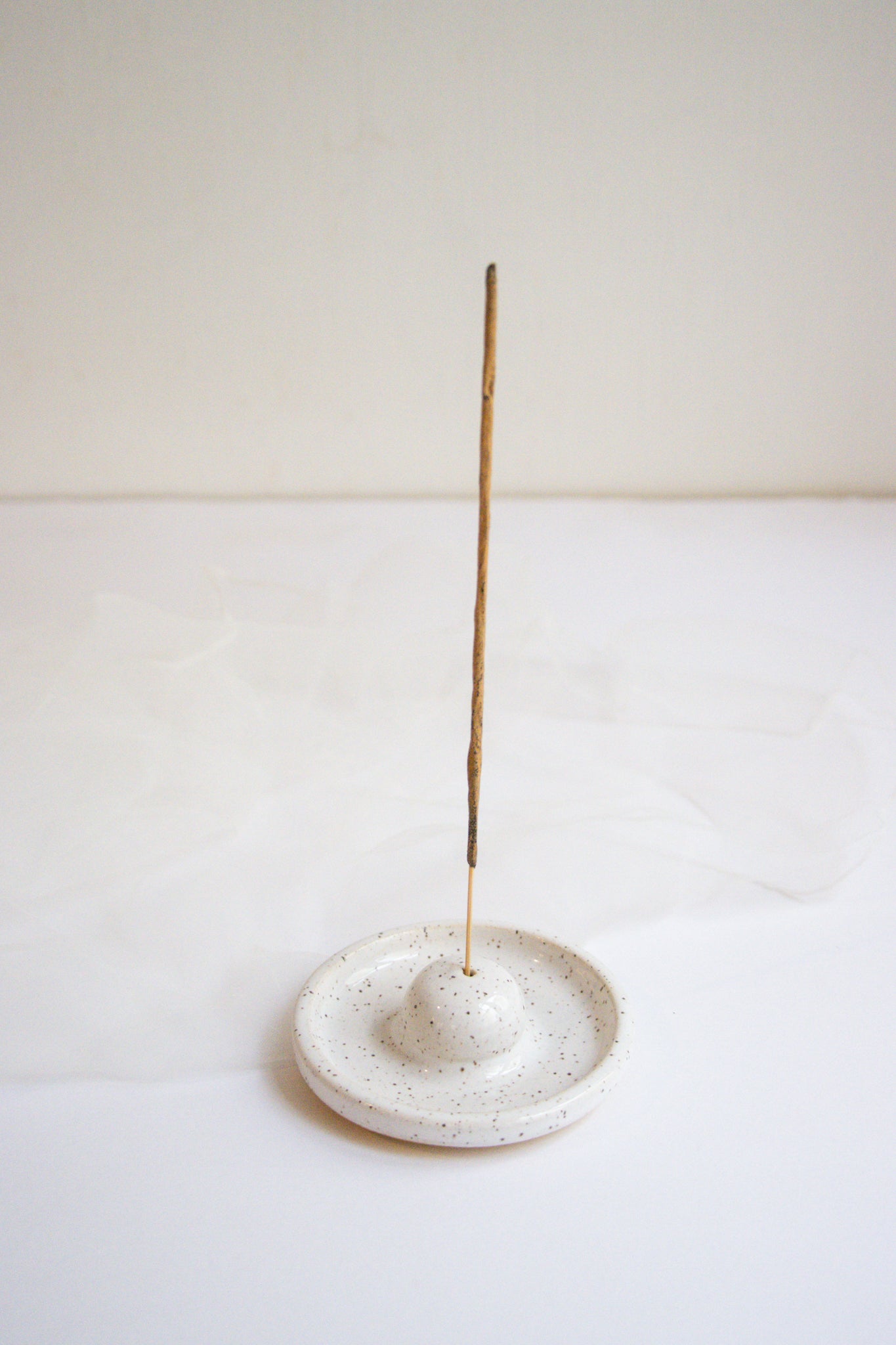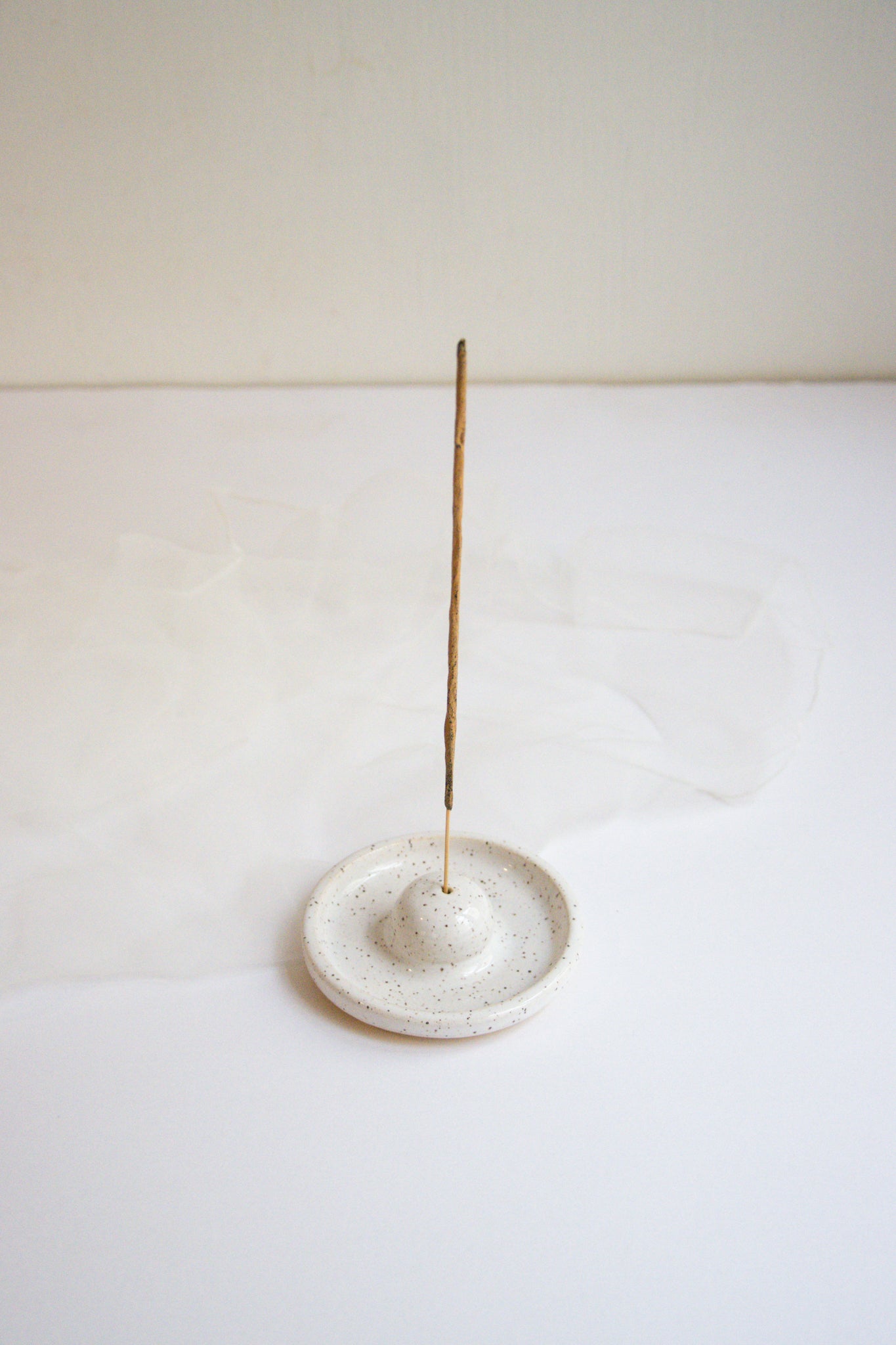 A circle incense holder in a classic speckled white with a small tray for catching ash.