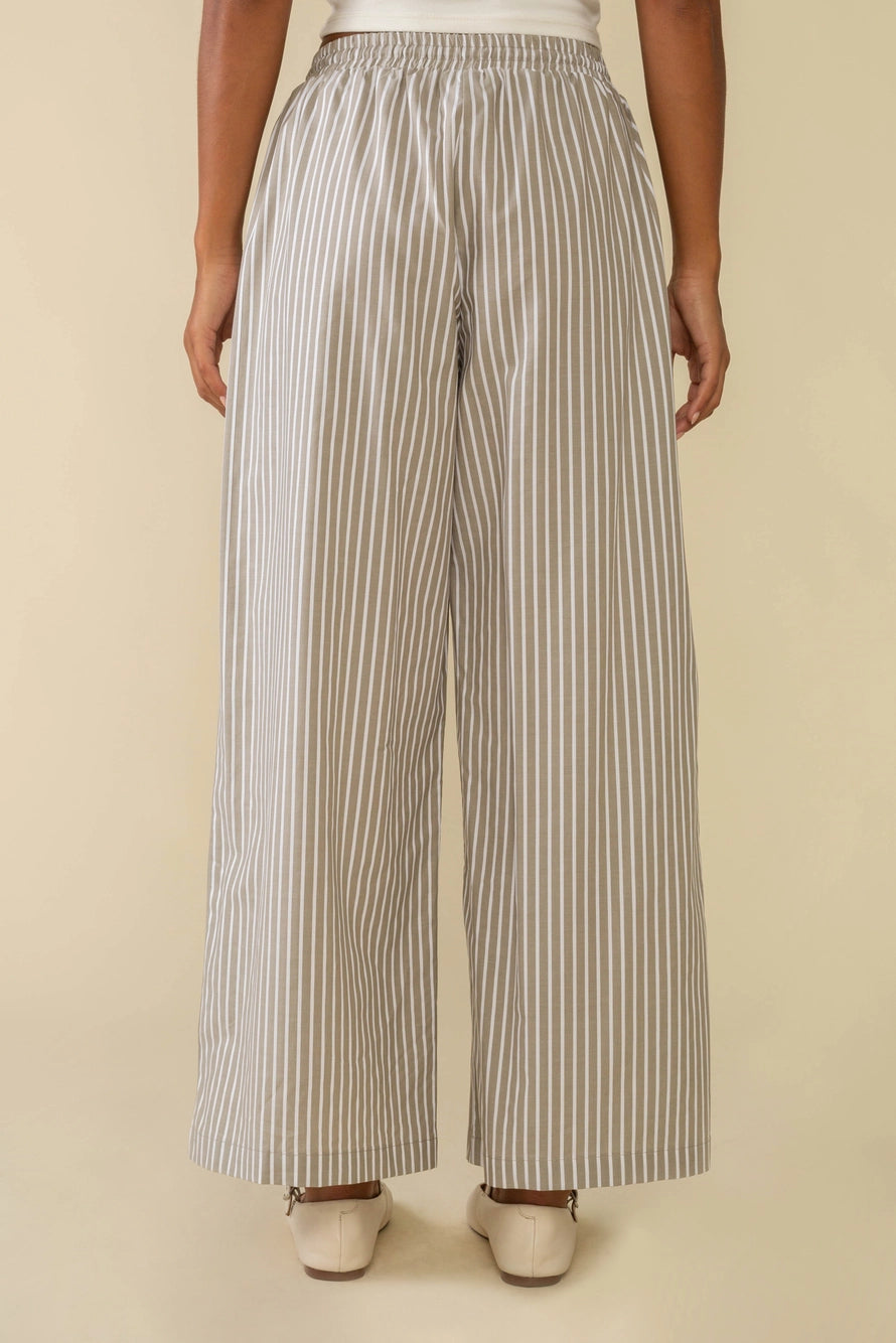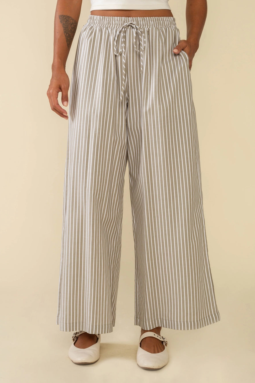 Vertical stripe wide leg culotte pant with elasticated waistband with drawstrings and pockets. In an olive and ivory stripe fabric.