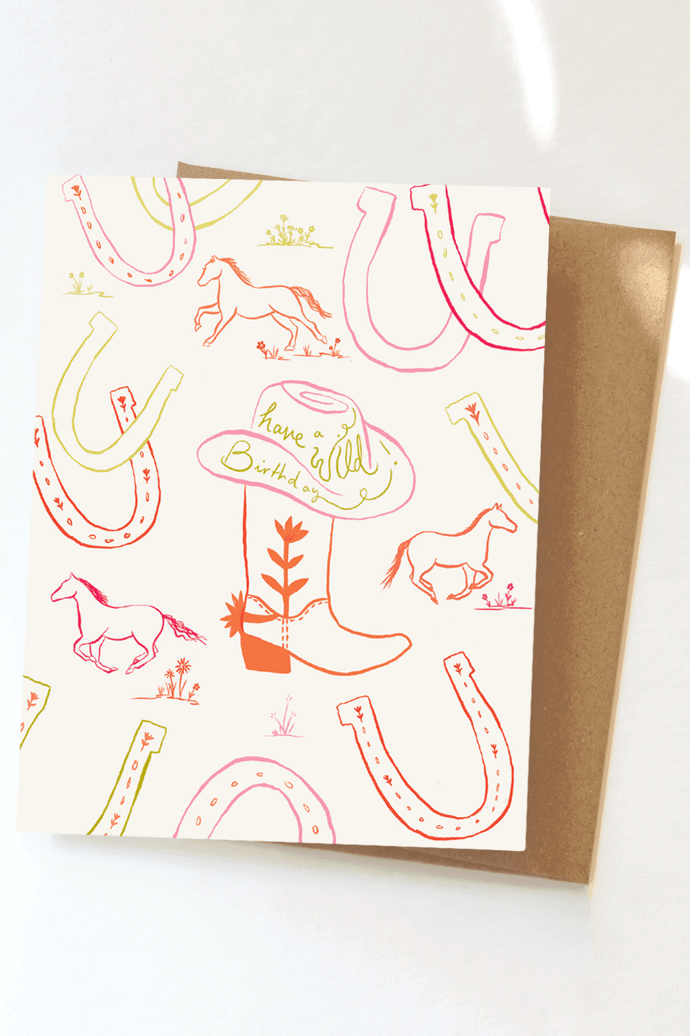 Saddle up for a joyful celebration with the Wild Birthday card featuring illustrated lucky horseshoes, wild horses, and cowgirl charm. Perfect for western-loving friends. Thoughtfully designed and sustainably made, each card is printed with vegetable and algae-based inks on 100% Post-Consumer Waste, FSC-certified stock. An eco-friendly, joyful addition to any shop’s stationery section.