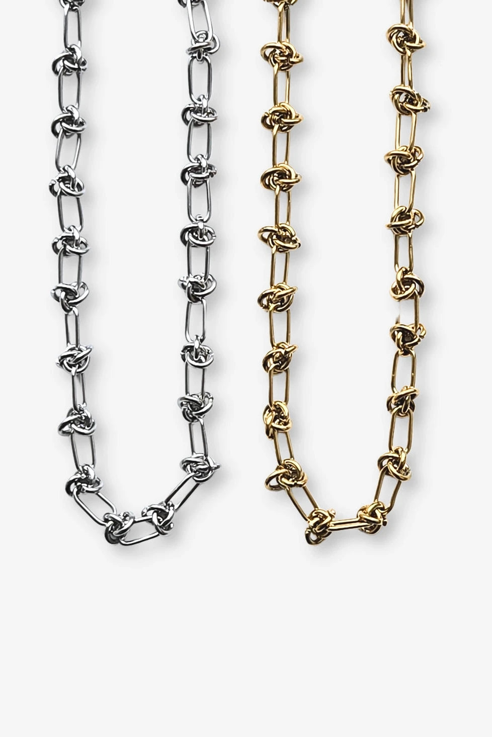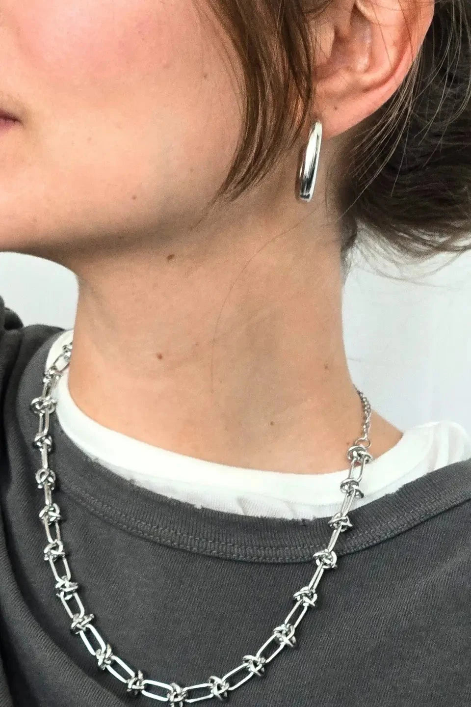 The roxy chain features linked rings in both oval and circle shapes intertwined to five it almost a barbed wire look. A fun and unique addition to your jewelry collection!
