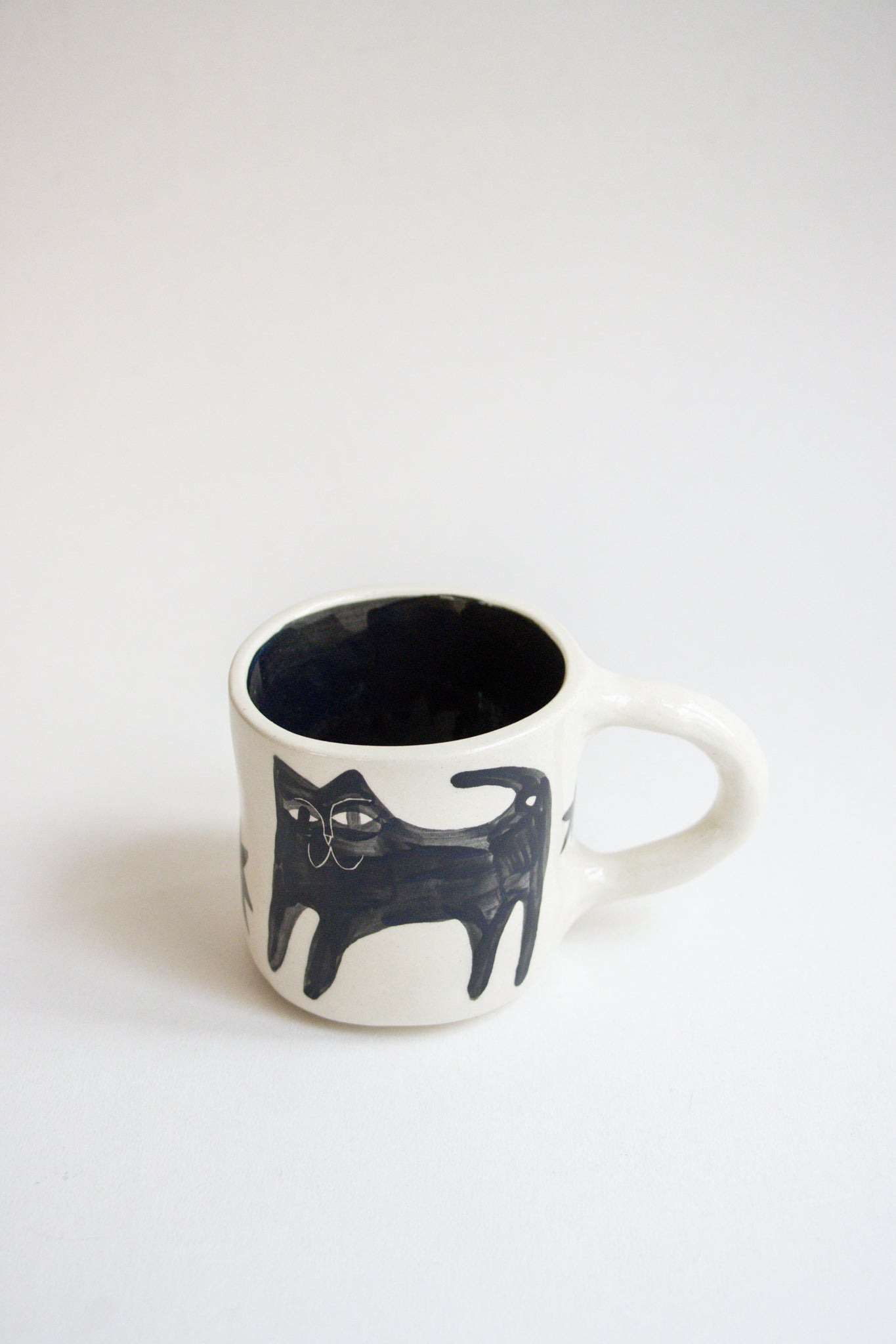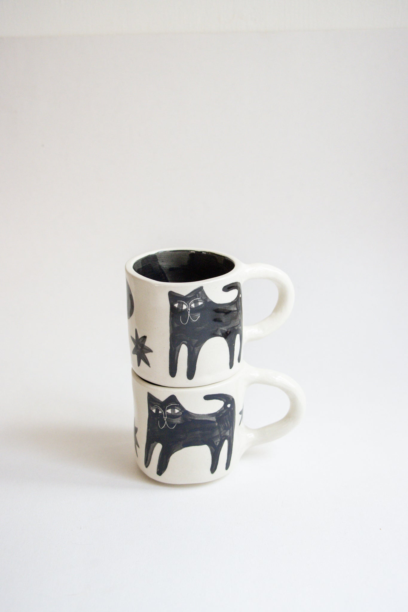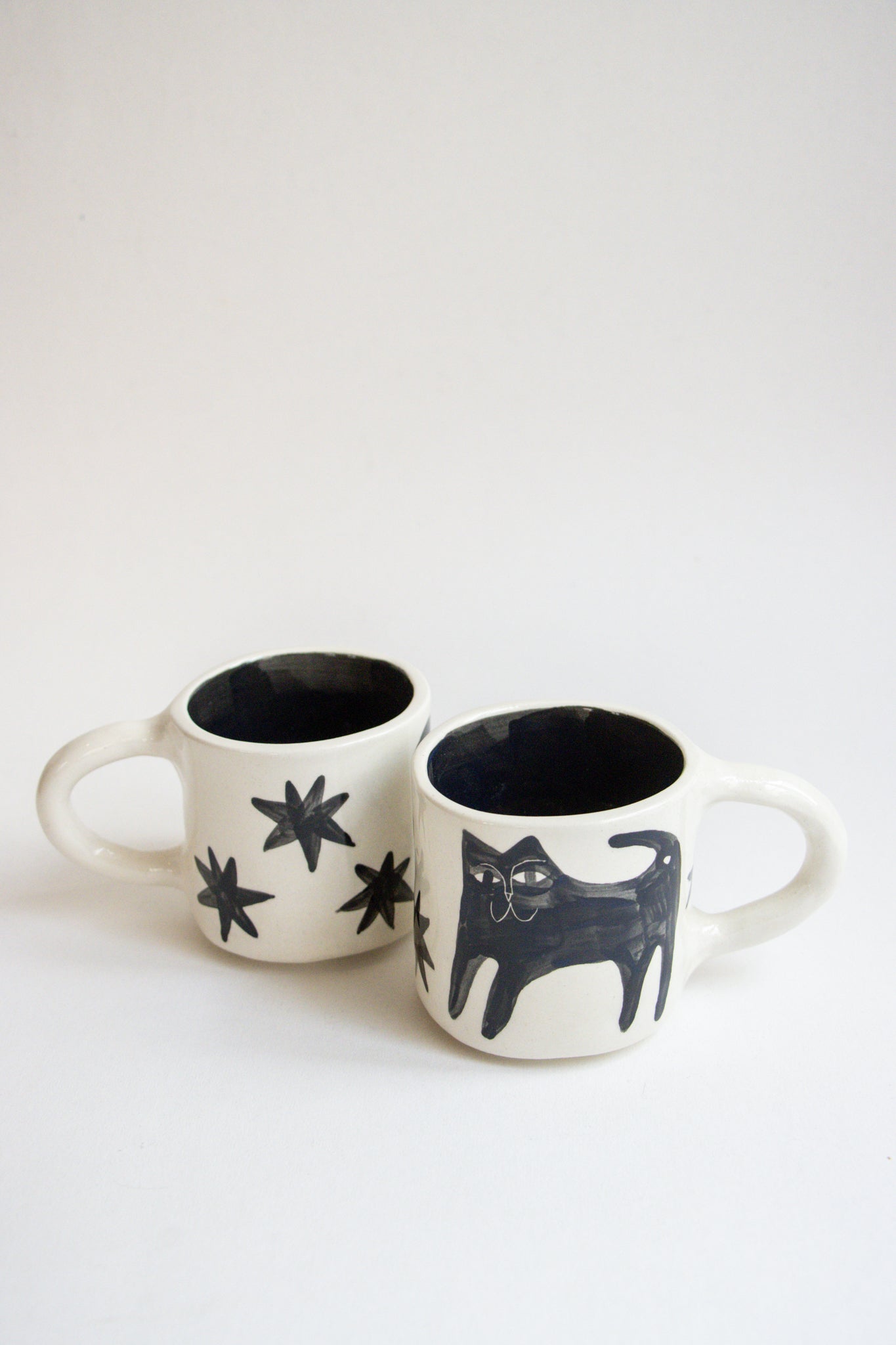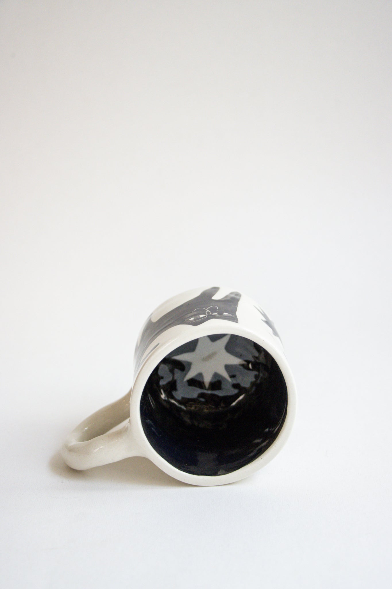 A beautiful hand built and hand painted ceramic mug featuring a black and white design with a cat and stars pattern. The inside is painted black with a white star at the bottom.