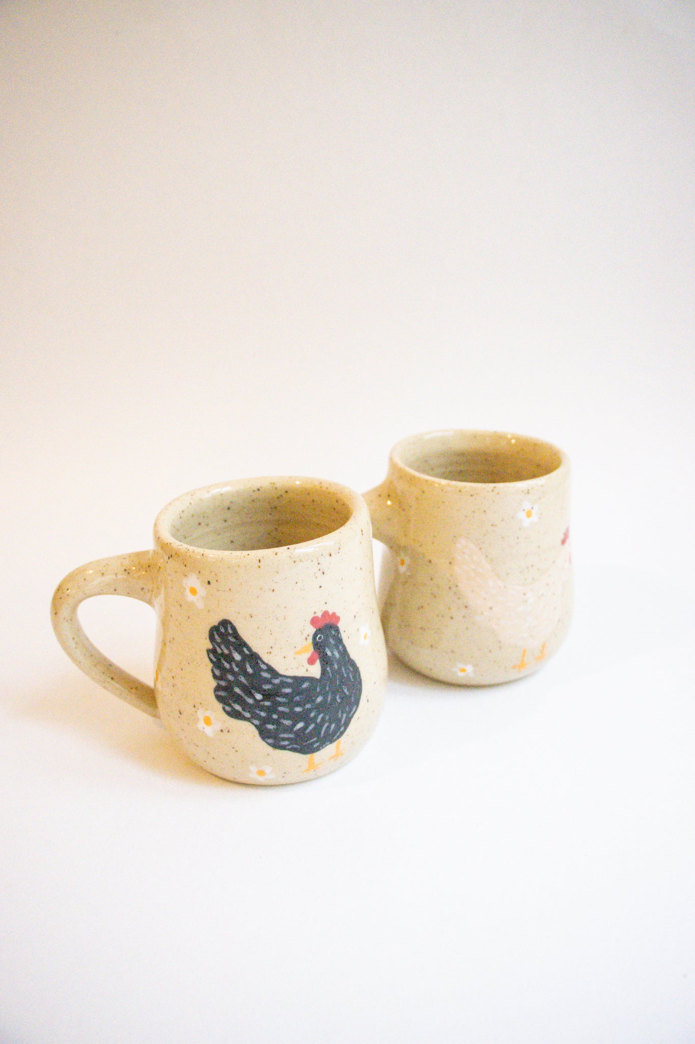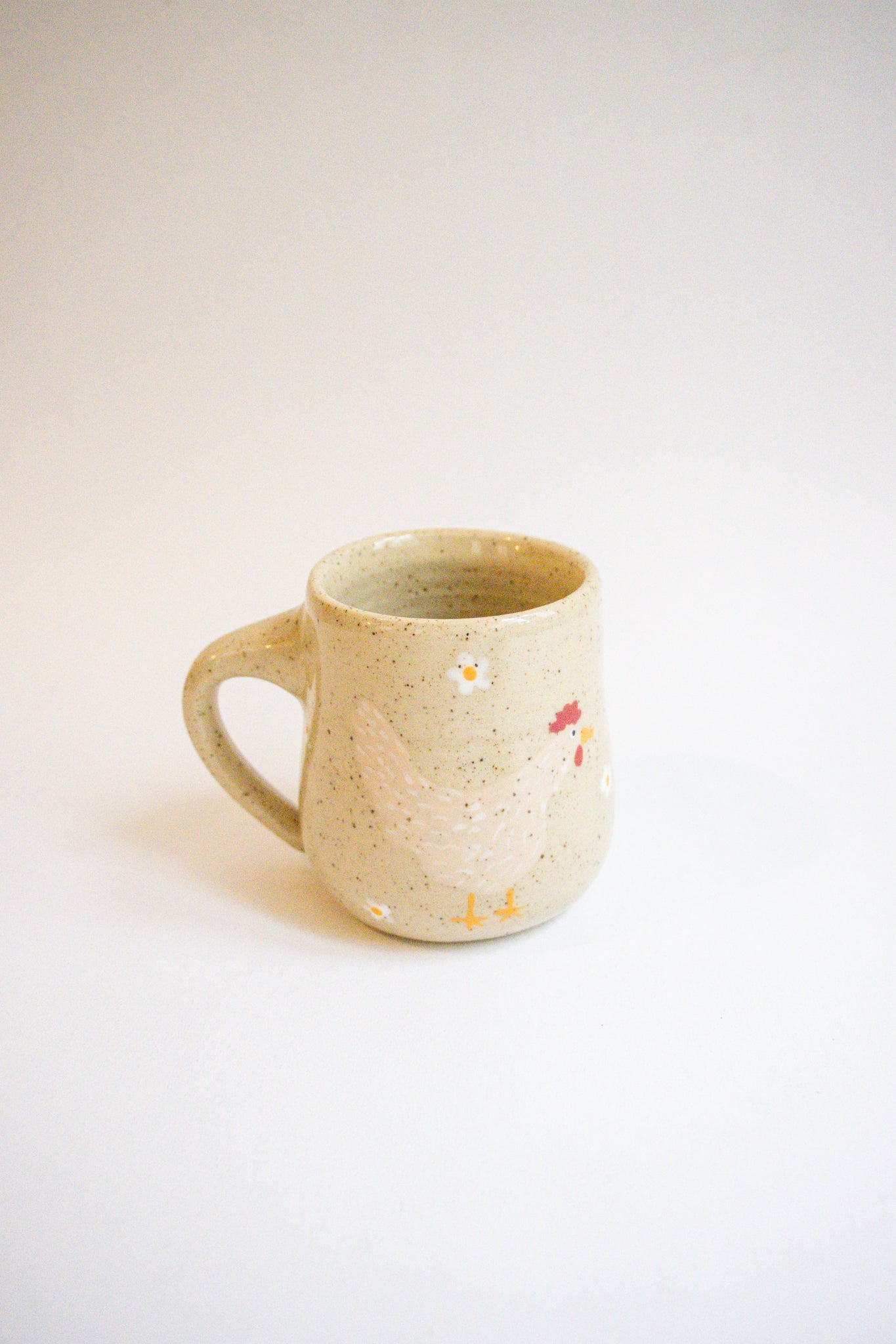 A beautiful wheel thrown mug with a hand painted chicken and floral design. Choose from a black or beige chicken. Colours and shapes will vary slightly with each mug giving you a 100% one of a kind piece.