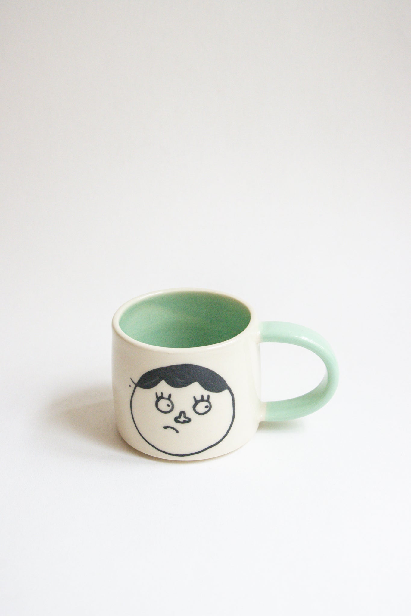 These doodle mug is sure to brighten your day with it's unique personality! Both sides of the mug feature a different emotive face. Each mug is unique and 100% one of a kind. Mug features a white base, aqua inside and coloured handle.