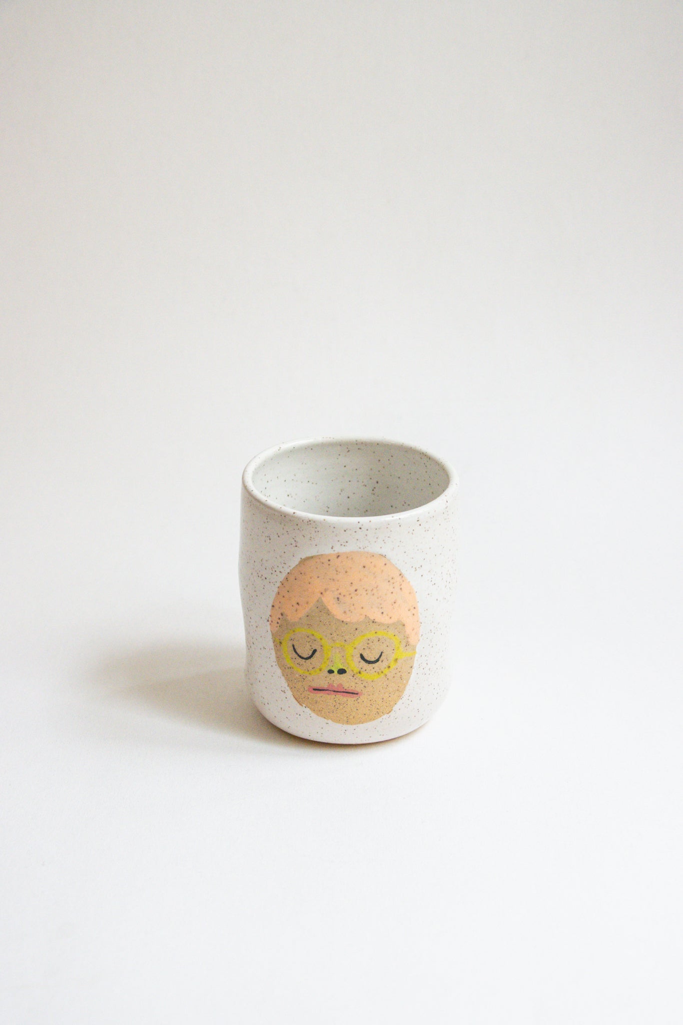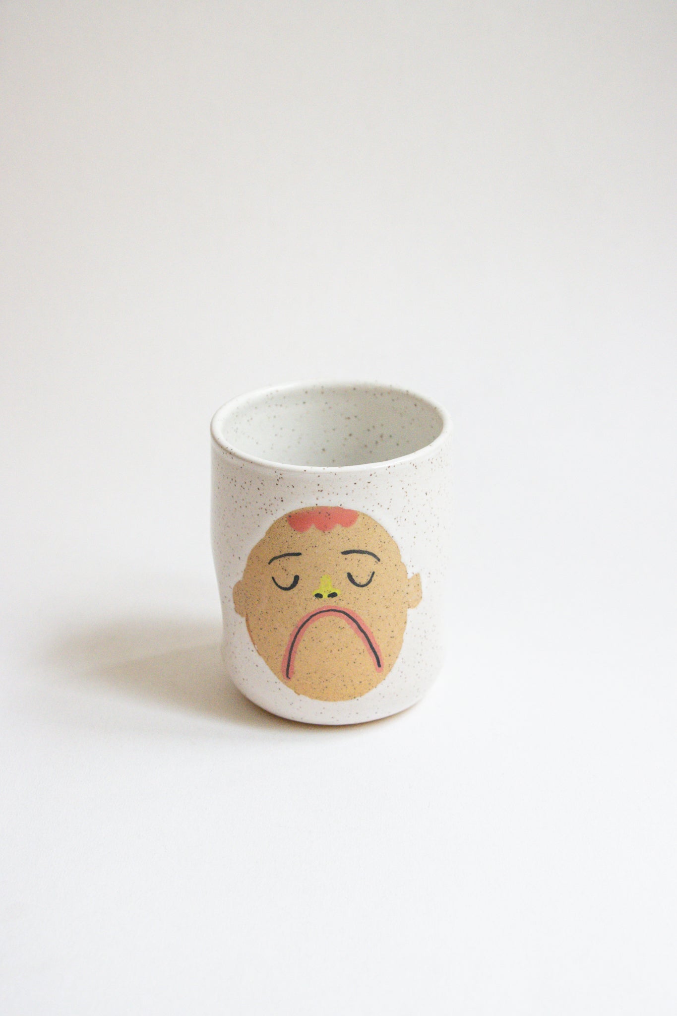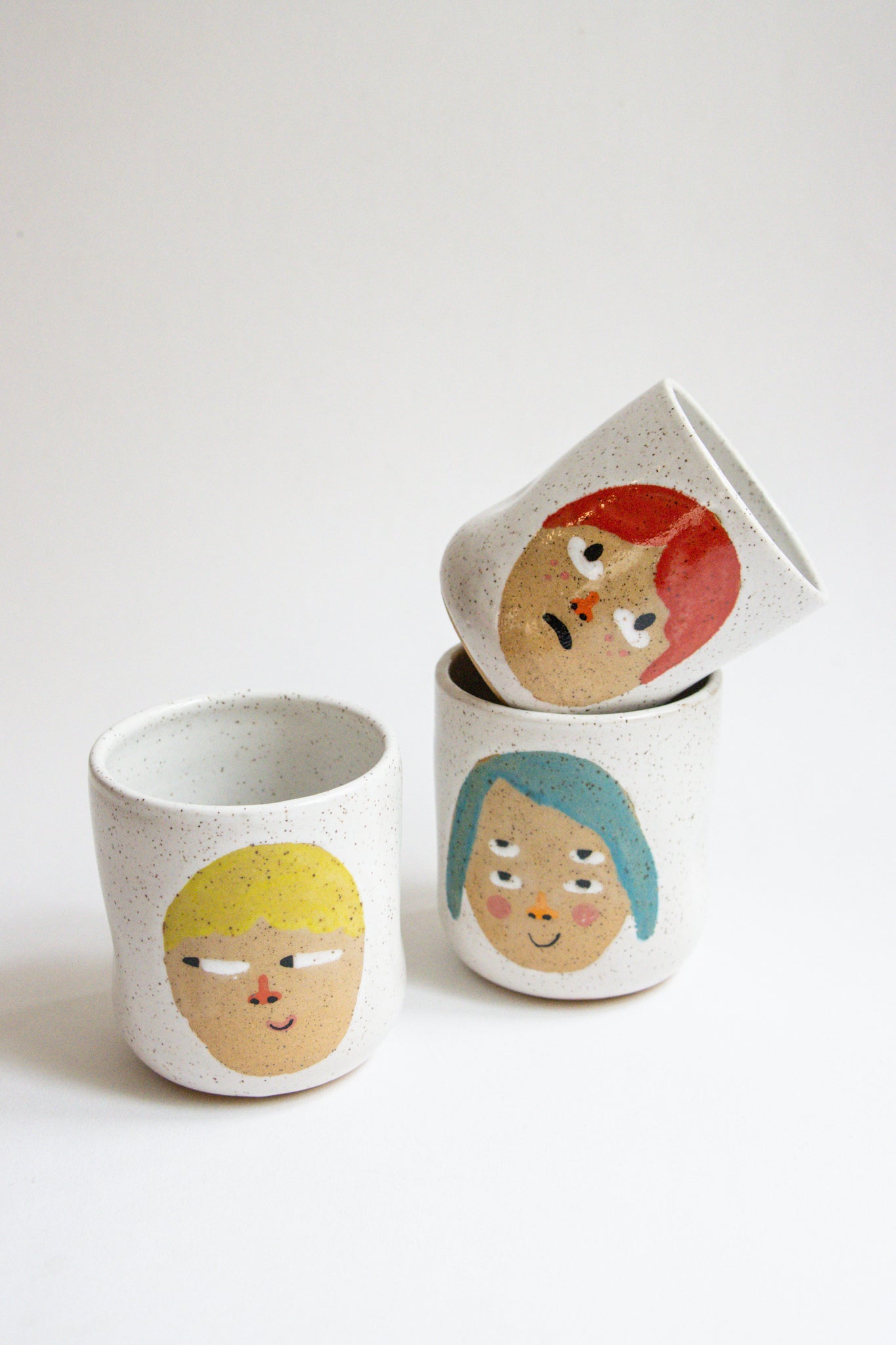 These funky face cups are sure to brighten your day with their unique personalities! Each one is unique and 100% one of a kind. Cup features a white speckles glaze and finger imprints for easy holding.