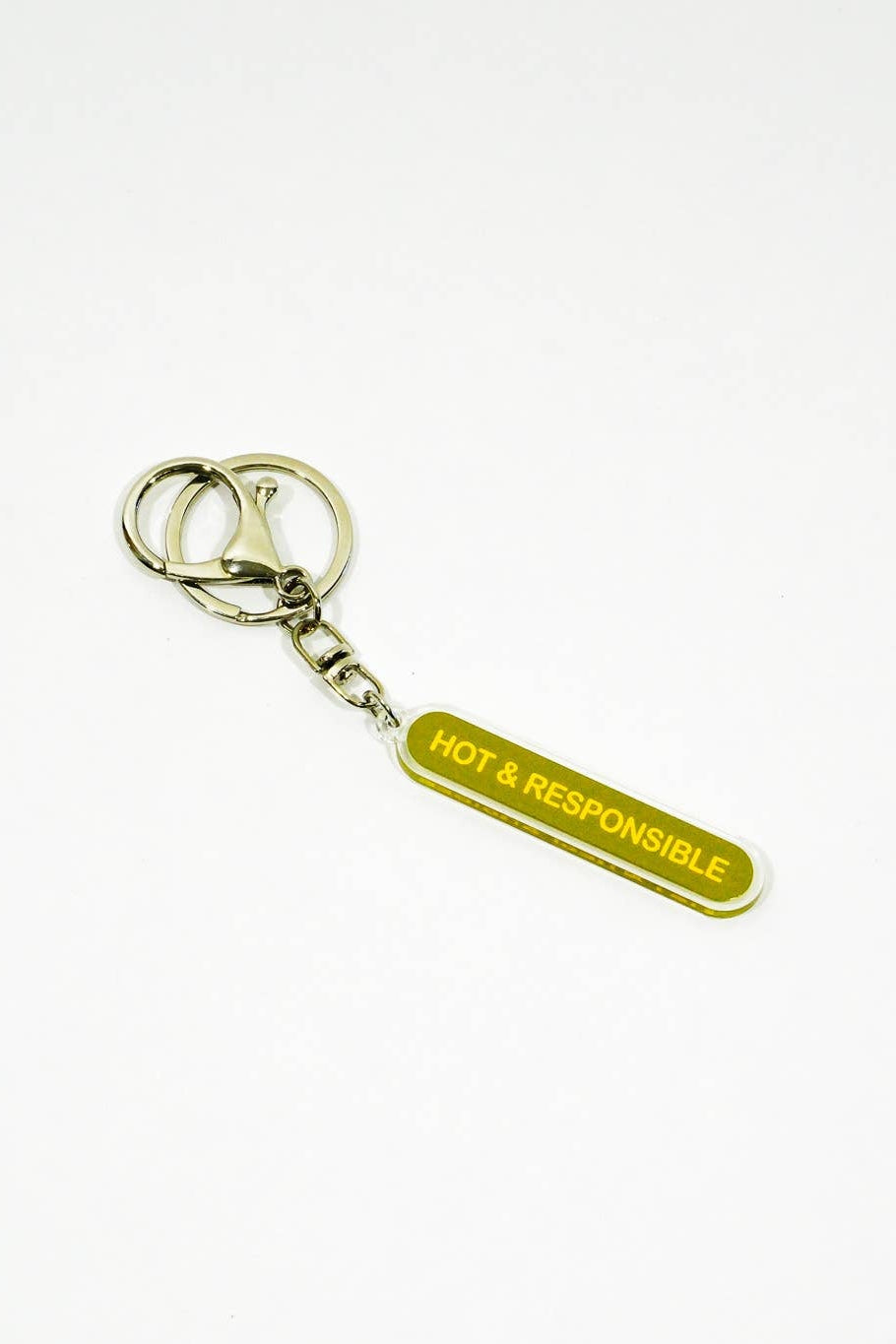 Recycled acrylic keychain / bag charm with funny descriptor "hot & responsible" (olive green background with light yellow text)