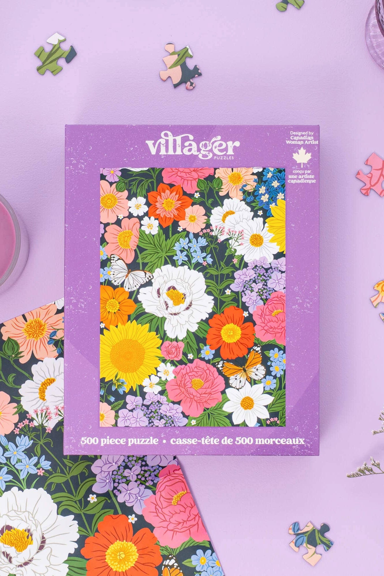 Designed to feel like stepping into a garden bursting with life, the scene brings together favourite florals including hydrangeas, roses, sunflowers, poppies, and loose wildflowers. Rather than a single focal point, the artwork invites an immersive experience where calm, joy, and new details unfold the longer you look, one puzzle piece at a time. Midnight Blooms is designed by Jori Pop, creator at Linden Paper Co.