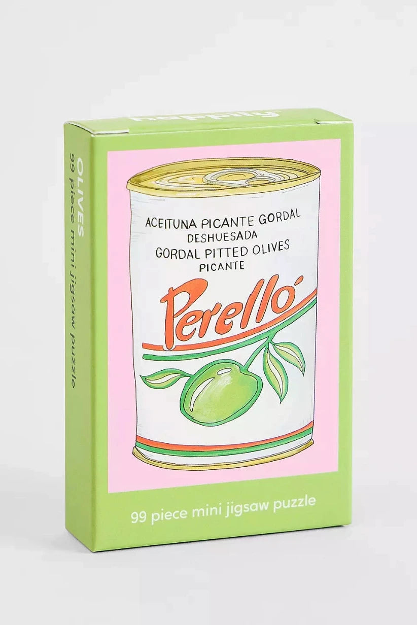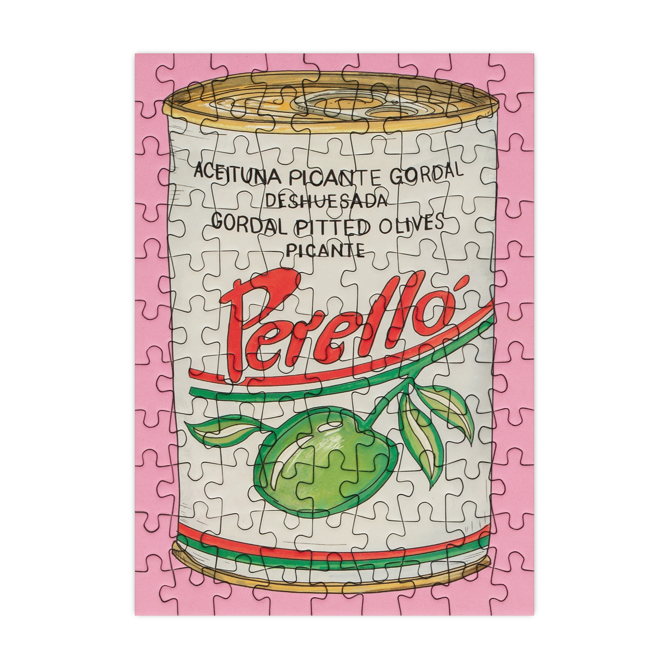 99 Piece Mini Jigsaw Puzzle featuring a fun illustration of can of olives by acclaimed illustrator Natalia Yañez-Stiel. The perfect gift for foodies.
