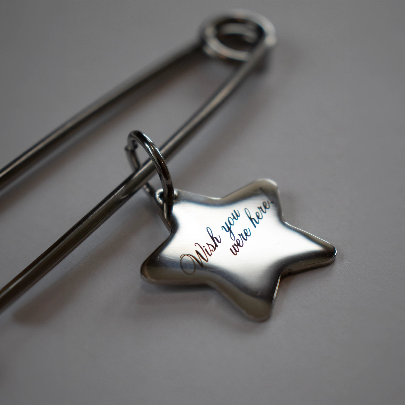 Our Oversized Safety Pin Keychain is the perfect addition to any bag - it easily opens and closes to loop around purse straps or onto belt loops, and has plenty of room to stack all of your favorite keychains. Each pin comes with a star-shaped charm engraved with “Wish you were here!” in cursive script.