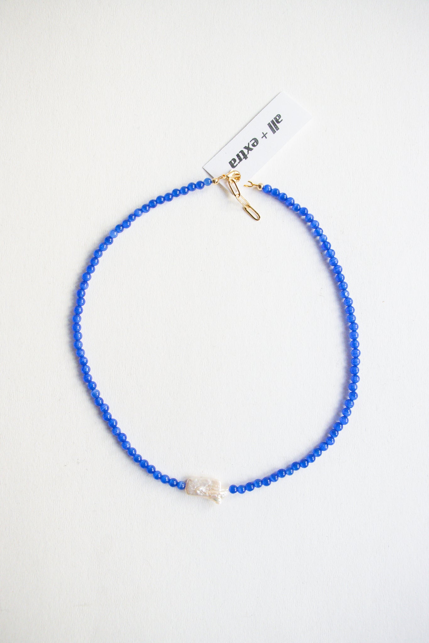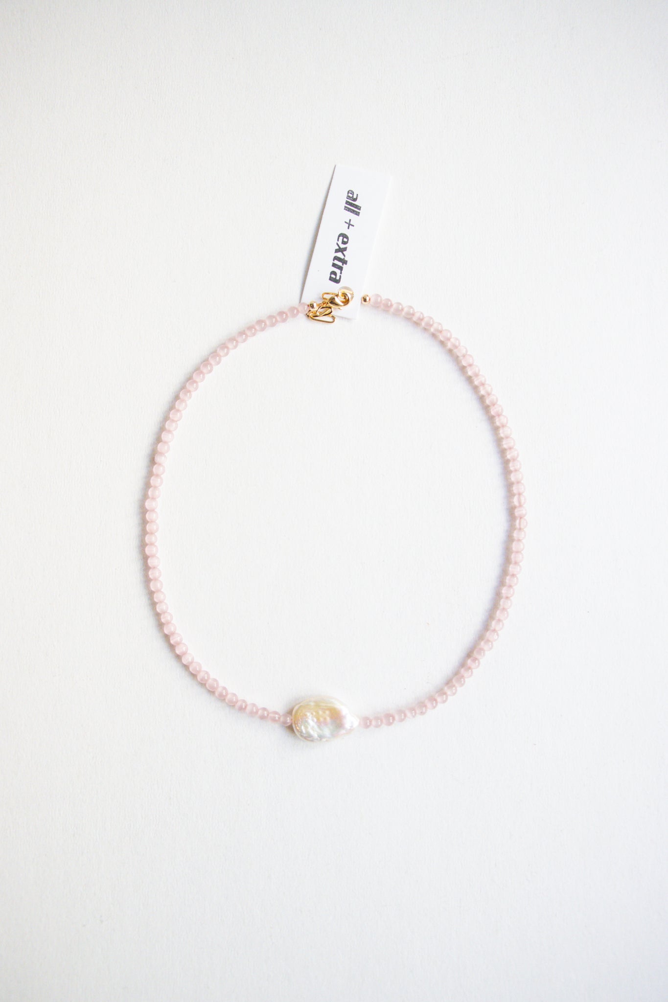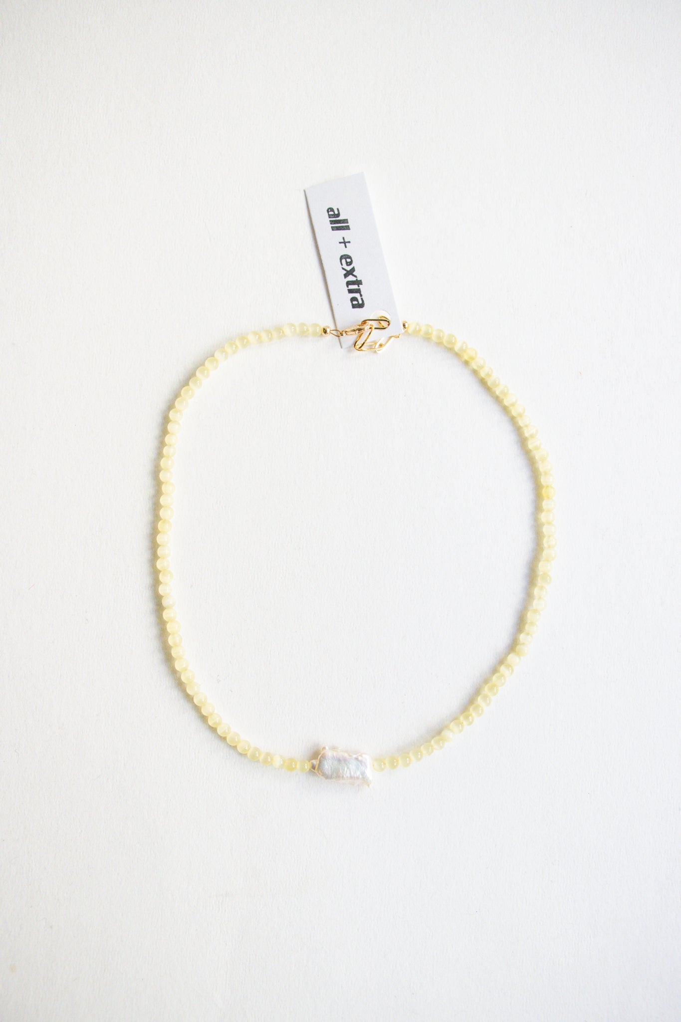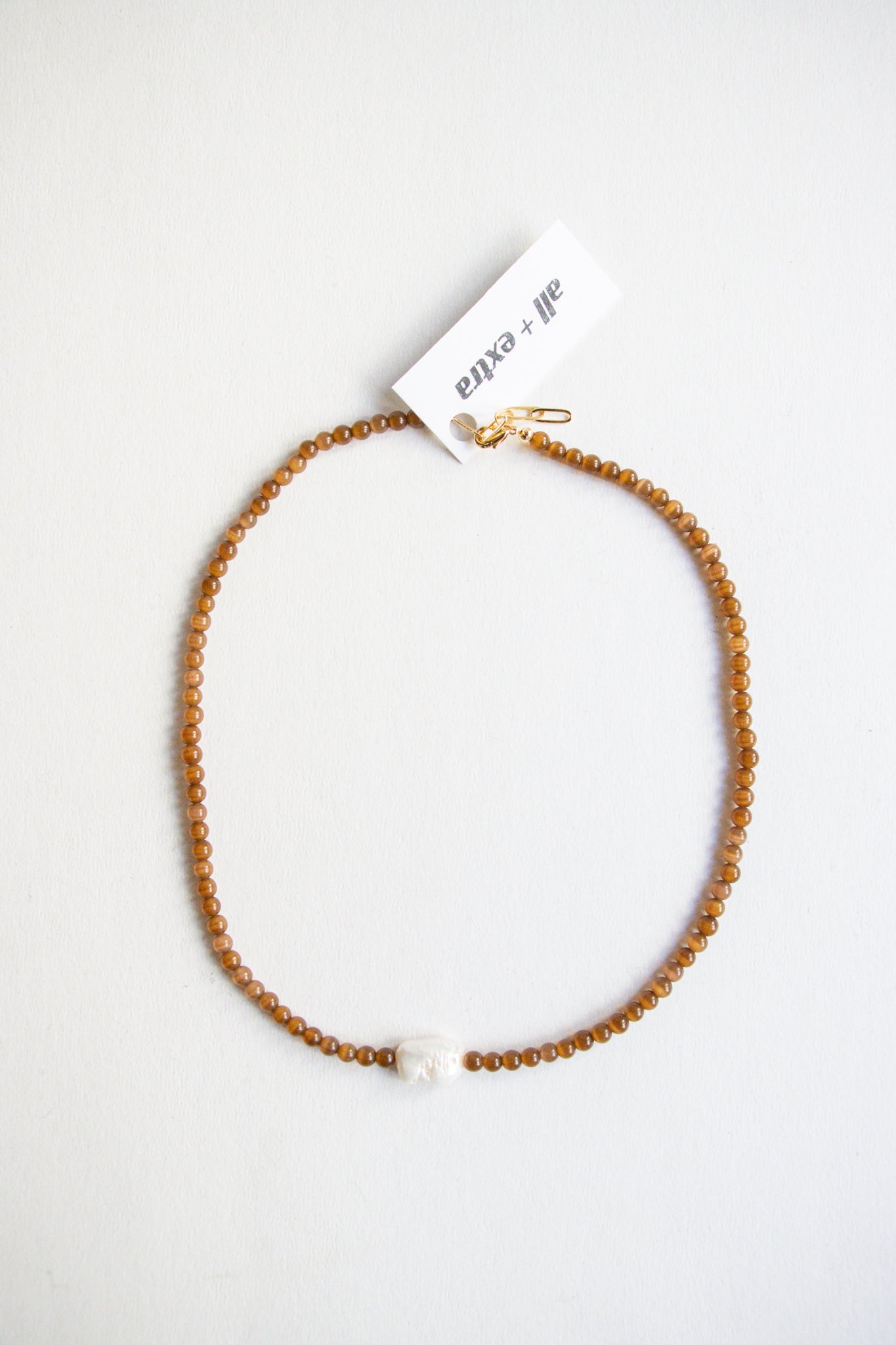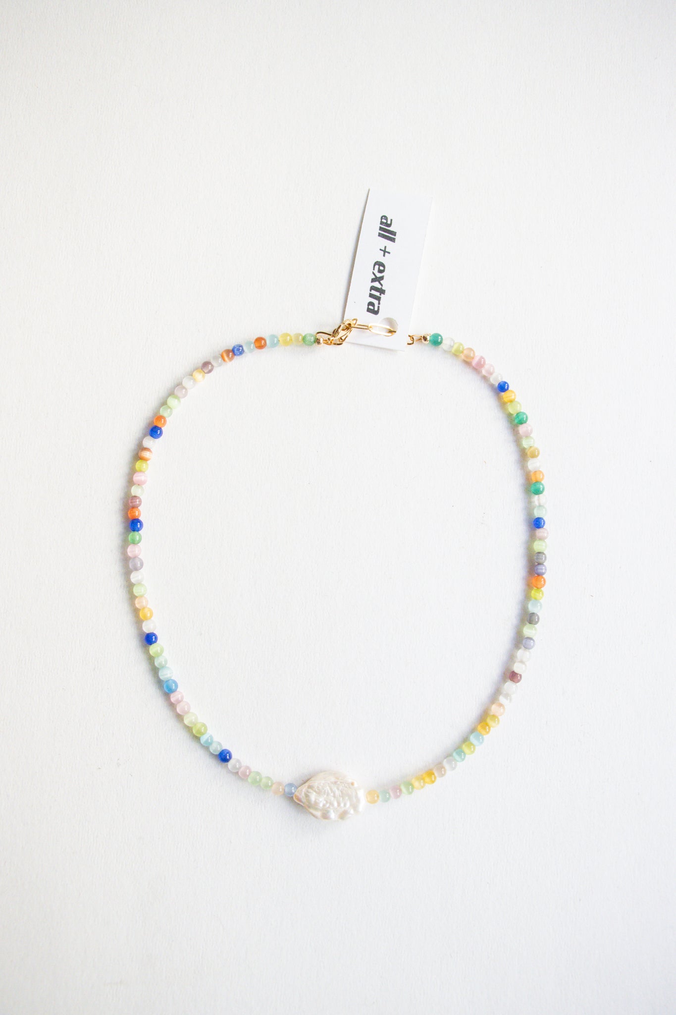A one of a kind beaded necklace featuring small beads and a flat pearl in the center with a gold-plated stainless steel clasp and extension. This necklace is adjustable, allowing you to layer it with pieces you may already have.