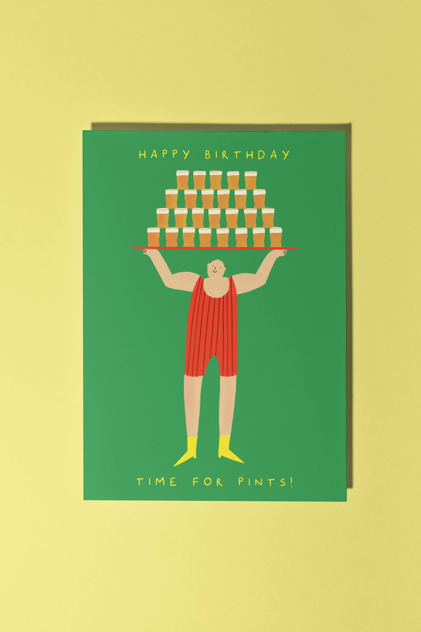 Strong man balancing a tray of pints. The perfect birthday card for beer lovers. Vibrant green background with text reading 'Happy Birthday, Time For Pints!'