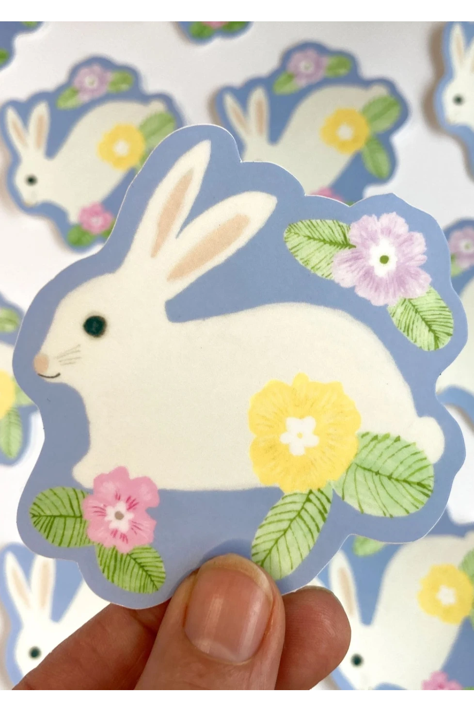A gorgeous bunny rabbit surrounded by spring flowers.