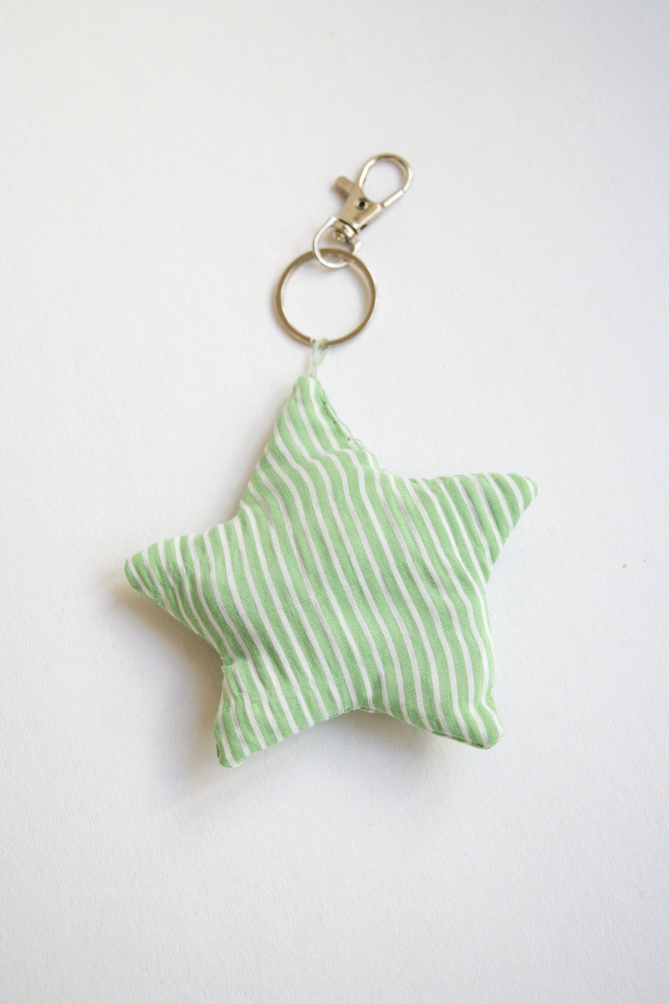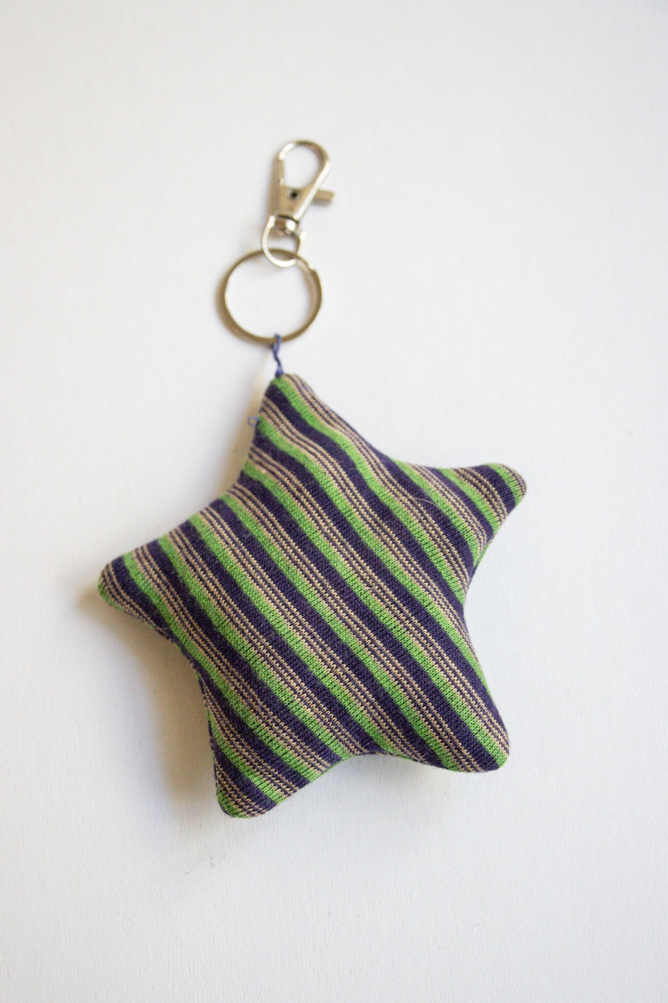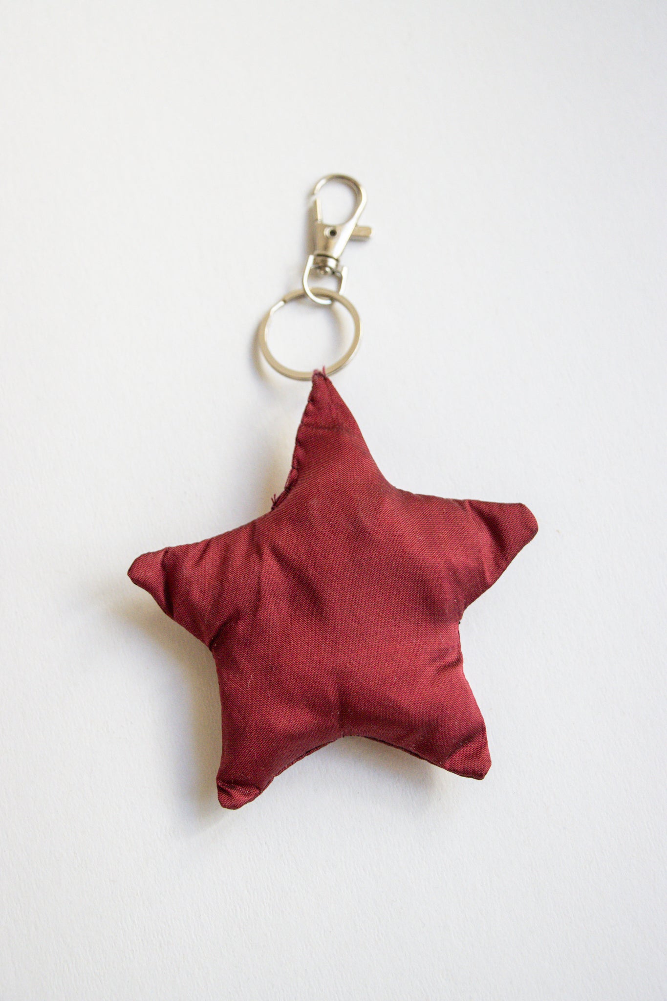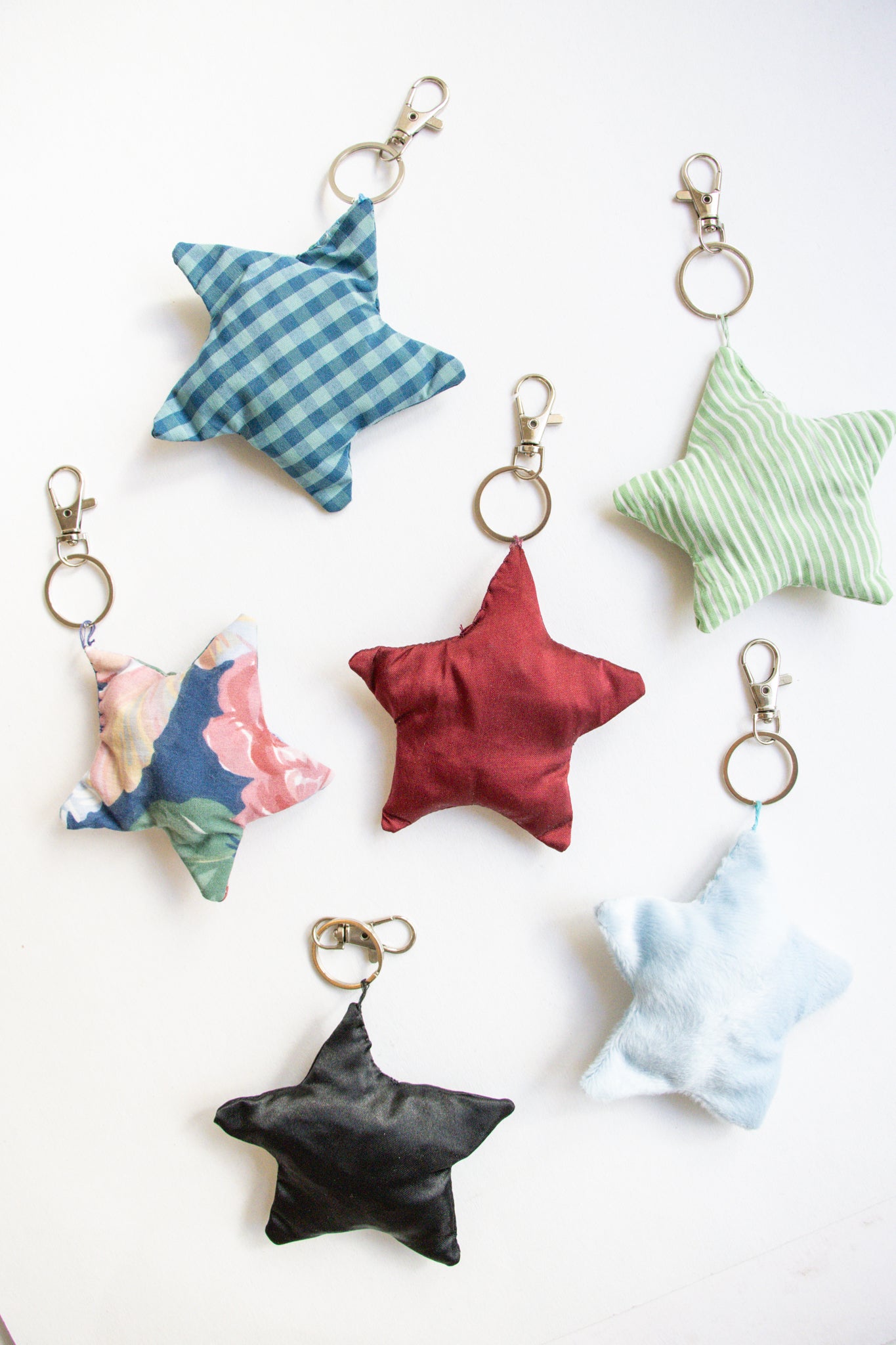 These handmade star charms are made with fabric scraps and leftover fabric from bags. The inside is stuffed with leftover fabric shreds and polyester filling. Each has a detachable swivel keychain and can be easily attached to keys or bag.