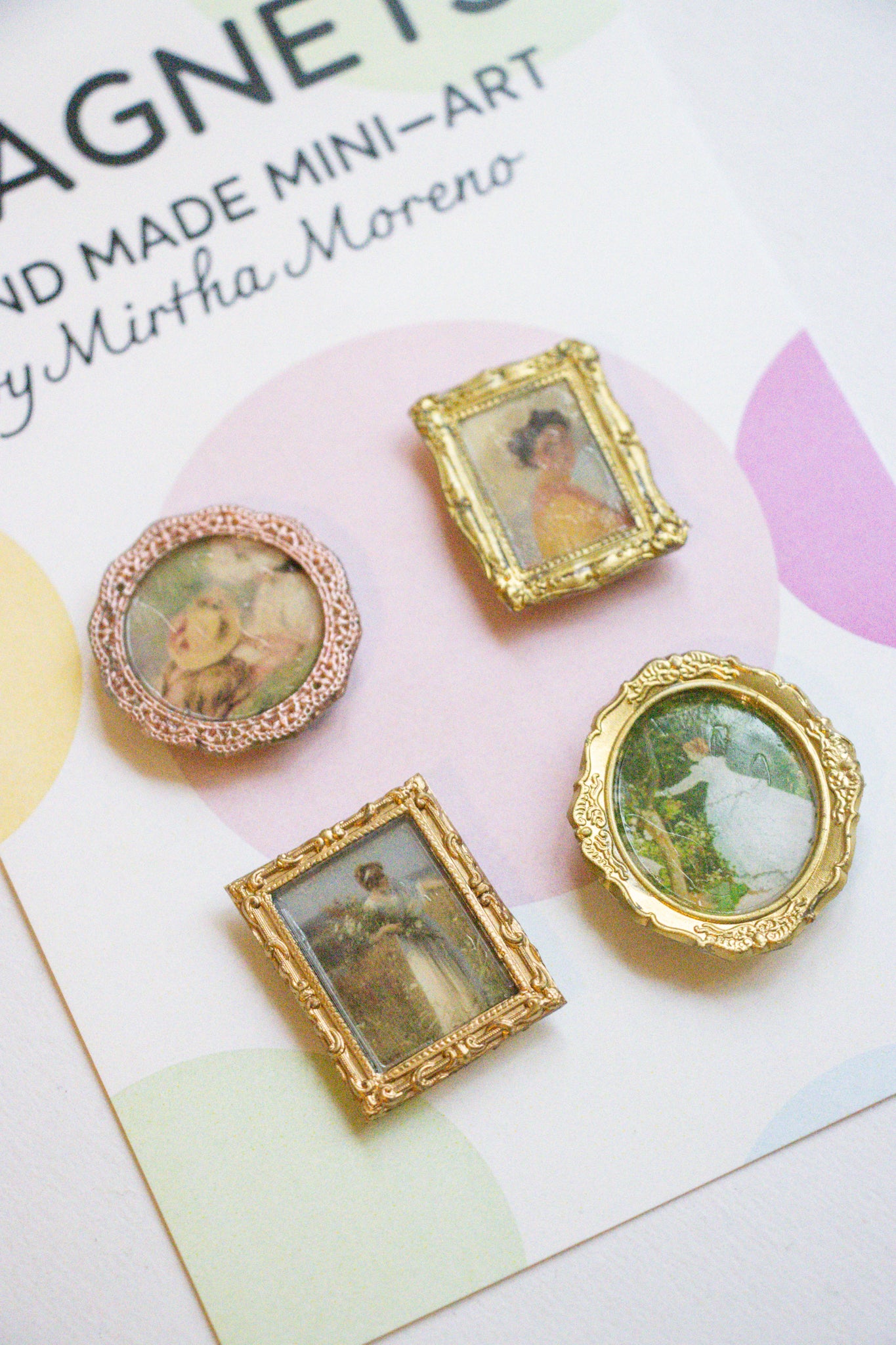 These Magnet sets from Art in Your Palm are a blend of elegance, function, and uniqueness. Each magnet in this set is a tiny masterpiece, handcrafted with love, featuring vintage-inspired imagery framed in ornate gold or silver.